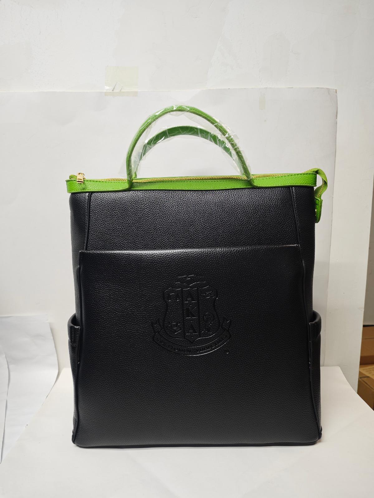 The exterior features a subtle yet striking green embossed shield, combining function with sorority style.
